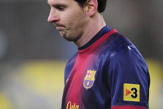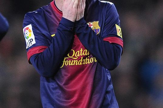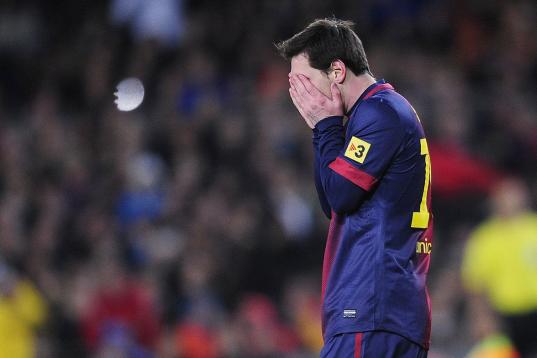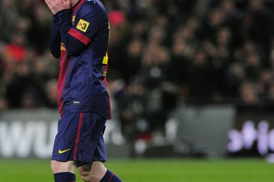 Barcelona's Lionel Messi from Argentina reacts after losing the Copa del Rey soccer match between FC Barcelona and Real Madrid at the Camp Nou stadium in Barcelona, Spain, Tuesday, Feb. 26, 2013. (AP Photo/Manu Fernandez)