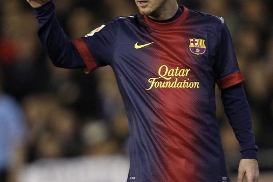 Barcelona's Lionel Messi from Argentina makes thumbs-up sign during their La Liga soccer match against Valencia at the Mestalla stadium in Valencia, Spain, Sunday, Feb. 3, 2013. (AP Photo/Alberto Saiz)