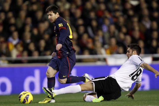 Barcelona's Lionel Messi from Argentina, left, duels for the ball with Valencia's Victor Ruiz, during their La Liga soccer match at the Mestalla stadium in Valencia, Spain, Sunday, Feb. 3, 2013. (AP Photo/Alberto Saiz)