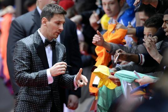 Argentina's Lionel Messi arrives on the red carpet prior to the FIFA Ballon d'Or soccer Gala 2013 held at the Kongresshaus in Zurich, Switzerland, on Monday, Jan. 7, 2013. (AP Photo/Keystone/Walter Bieri)