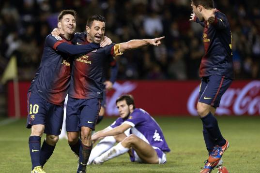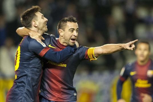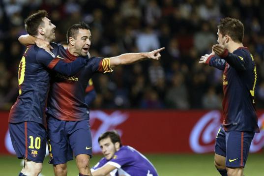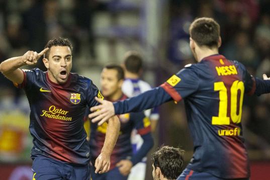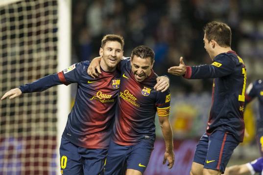 VALLADOLID, SPAIN - DECEMBER 22: Xavi Hernandez (C) of FC Barcelona celebrates with his teammate Lionel Messi after scoring against Real Valladolid at Jose Zorrilla on December 22, 2012 in Valladolid, Spain. (Photo by Victor Fraile/Getty Images)