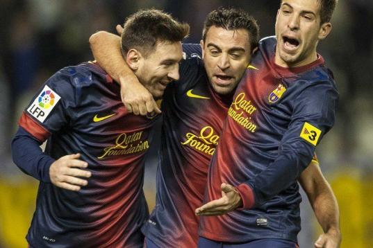 VALLADOLID, SPAIN - DECEMBER 22: Xavi Hernandez (C) of FC Barcelona celebrates with his teammates Lionel Messi (L) and Jordo Alba after scoring against Real Valladolid at Jose Zorrilla on December 22, 2012 in Valladolid, Spain. (Photo by Victo...