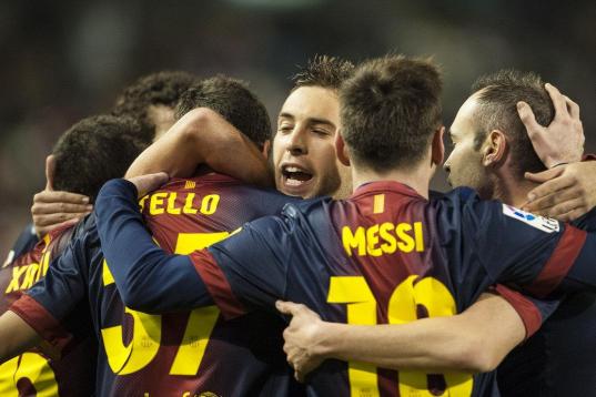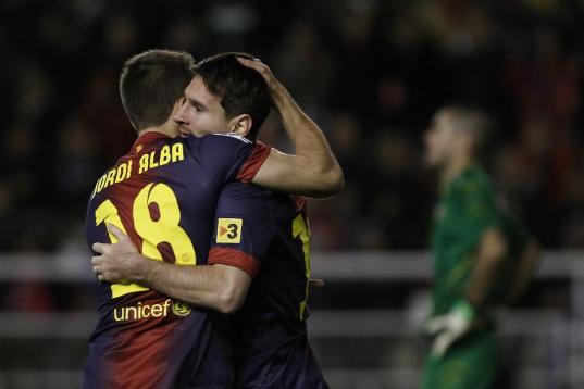 FC Barcelona's Lionel Messi from Argentina, second left, celebrates his goal with Jordi Alba, left, during a Spanish La Liga soccer match against Rayo Vallecano at the Teresa Rivero stadium in Madrid, Spain, Saturday, Oct. 27, 2012. (AP Photo/An...