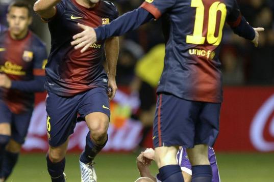 Barcelona's Argentinian forward Lionel Messi (L) celebrates after scoring during the Spanish league football match Real Valladolid vs FC Barcelona at the Jose Zorilla stadium in Valladolid on December 22, 2012. Barcelona won the match 3-1. AFP ...