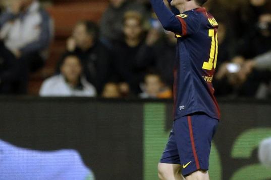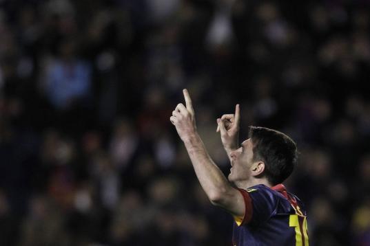 Barcelona's Lionel Messi from Argentina celebrates after scoring against Valencia during their La Liga soccer match at the Mestalla stadium in Valencia, Spain, Sunday, Feb. 3, 2013. (AP Photo/Alberto Saiz)