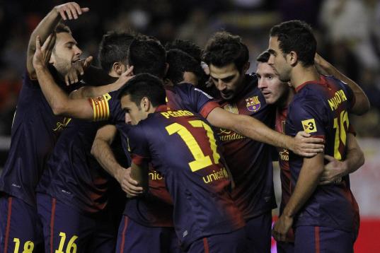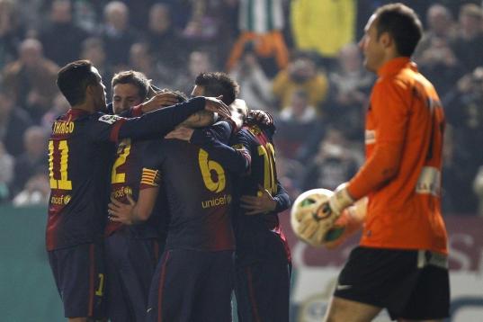 Barcelona's Lionel Messi celebrates with teammates after scoring against Cordoba during the 1st leg of a last-16 Copa del Rey soccer match at Arcangel stadium in, Cordoba, Spain on Wednesday, Dec. 12, 2012. (AP Photo/Angel Fernandez)