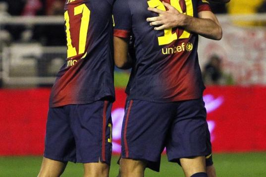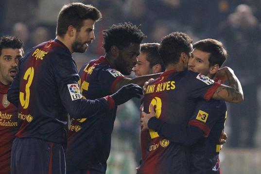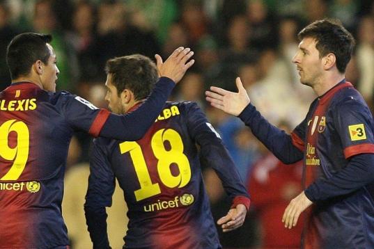 Barcelona's Lionel Messi from Argentina, right, celebrates with teammate Alexis Sanchez, left, after scoring against Betis during their La Liga soccer match at the Benito Villamarin stadium, in Seville, Spain on Sunday, Dec. 9, 2012. (AP Photo/A...