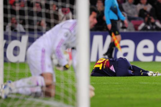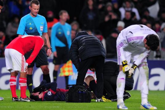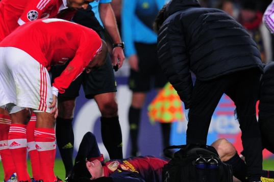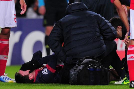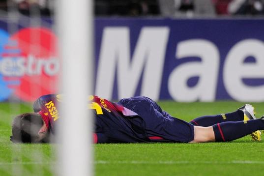 Barcelona's Argentinian forward Lionel Messi lies on the pitch after being injured during the UEFA Champions League football match FC Barcelona vs SL Benfica at the Camp Nou stadium in Barcelona on December 5, 2012. AFP PHOTO / LLUIS GENE ...
