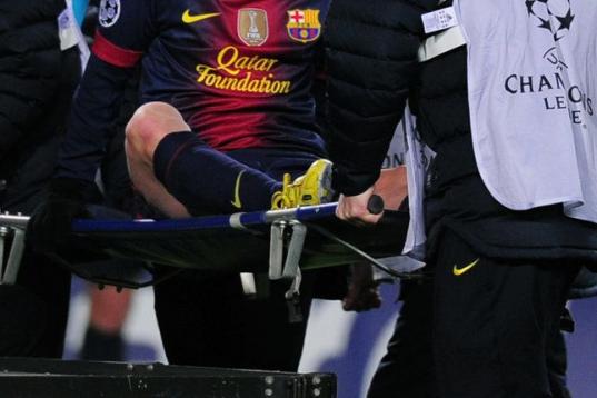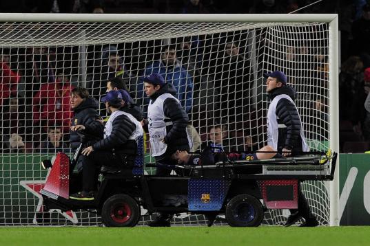 Barcelona's Argentinian forward Lionel Messi leaves the pitch on a stretcher after being injured during the UEFA Champions League football match FC Barcelona vs SL Benfica at the Camp Nou stadium in Barcelona on December 5, 2012. AFP PHOTO / JO...
