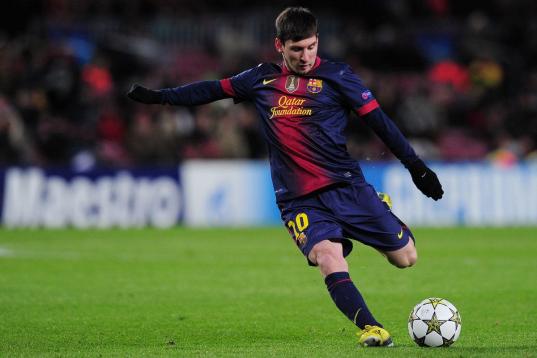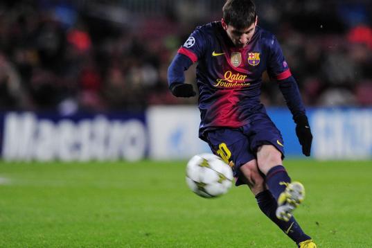 Barcelona's Argentinian forward Lionel Messi kicks the ball during the UEFA Champions League football match FC Barcelona vs SL Benfica at the Camp Nou stadium in Barcelona on December 5, 2012. AFP PHOTO / LLUIS GENE (Photo credit should ...