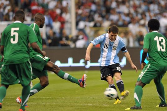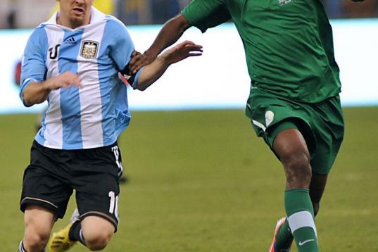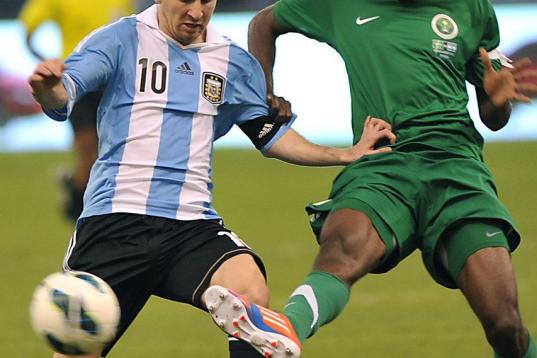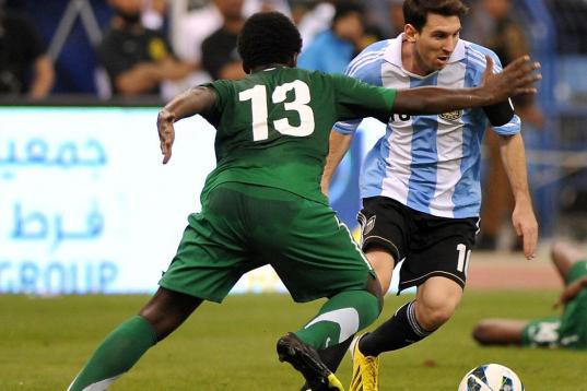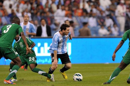 Saudi Arabia's Motaz al-Musa (L) challenges Argentina's forward Lionel Messi during their friendly football match at King Fahd stadium in the Saudi capital Riyadh on November 14, 2012. The match ended in a goalless draw. AFP PHOTO/FAYEZ NURELDIN...