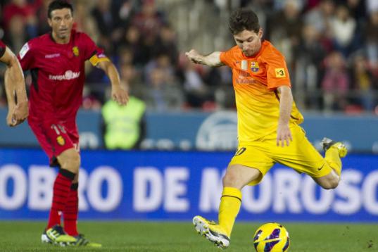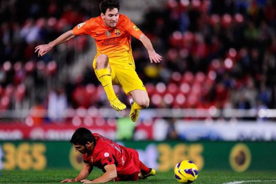 MALLORCA, SPAIN - NOVEMBER 11: Lionel Messi of FC Barcelona duels for the ball with Bigas of RCD Mallorca during the La Liga match between RCD Mallorca and FC Barcelona at Iberostar Stadium on November 11, 2012 in Mallorca, Spain. (Photo by Da...