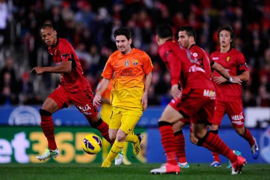 MALLORCA, SPAIN - NOVEMBER 11: Lionel Messi of FC Barcelona (2ndL) duels for the ball with RCD Mallorca players during the La Liga match between RCD Mallorca and FC Barcelona at Iberostar Stadium on November 11, 2012 in Mallorca, Spain. (Photo...