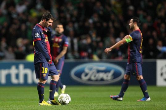 Barcelona's Lionel Messi, stand's dejected after being defeated by Celtic at the end of their Champions League Group G soccer match at Celtic Park, Glasgow, Scotland, Wednesday Nov. 7, 2012. (AP Photo/Scott Heppell)