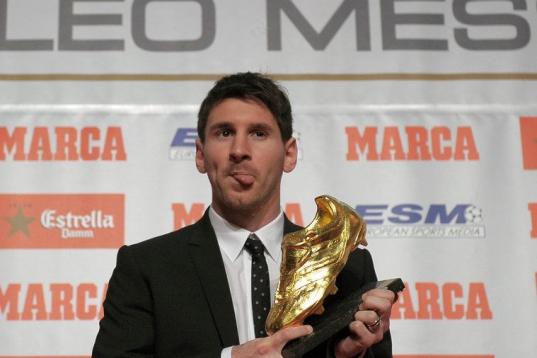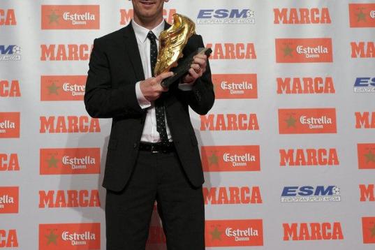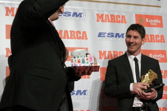 Barcelona's Argentinian forward Lionel Messi (R) poses after receiving the European Golden Boot 2012 award for best European goalscorer of the 2011-2012 season next to Oscar Campillo, director of the Marca sports newspaper, on October 29, 2012 i...
