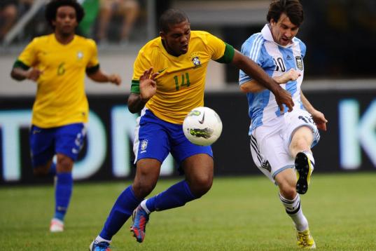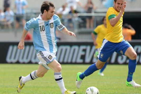 Argentine player Lionel Messi (10) kicks past Brazilian player Bruno Uvini to score the first goal during the friendly match Argentina against Brazil at the MetLife Stadium in East Rutherford, New Jersey, on June 9, 2012. AFP PHOTO/Emmanuel Duna...