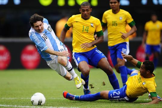 Argentinian soccer player Lionel Messi is tackled by Brazil's Danilo (R) as Juan (C) and Casemiro look on during a friendly match at MetLife Stadium in East Rutherford, New Jersey, on June 9, 2012. Argentina won 4-3. AFP PHOTO/Mehdi Taamallah...
