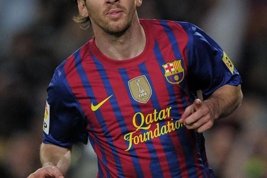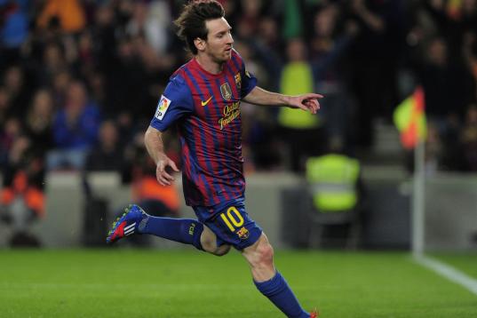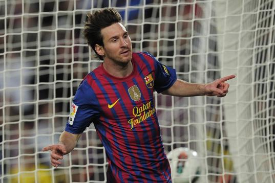 Barcelona's Argentinian forward Lionel Messi celebrates after scoring during the Spanish League football match Barcelona vs Malaga at the Camp Nou stadium in Barcelona on May 2, 2012. AFP PHOTO/ JOSEP LAGO (Photo credit should read JOSEP ...