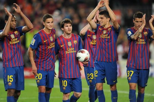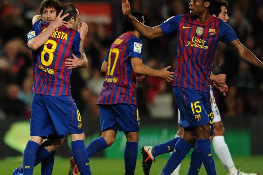 Barcelona's Argentinian forward Lionel Messi (3L) celebraes with teammates after the Spanish league football match FC Barcelona vs Malaga CF on May 2, 2012 at the Camp Nou stadium in Barcelona. Barcelona won 4-1. AFP PHOTO/LLUIS GENE (Pho...