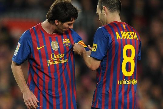 Barcelona's midfielder Andres Iniesta (R) gives the captain's armband to Barcelona's Argentinian forward Lionel Messi during the Spanish league football match FC Barcelona vs Malaga CF on May 2, 2012 at the Camp Nou stadium in Barcelona. AFP PH...
