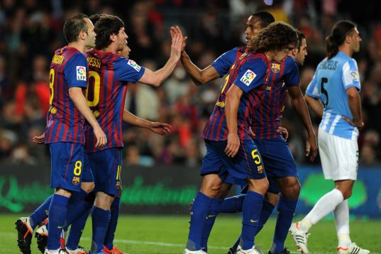Barcelona's Argentinian forward Lionel Messi (2L) celebrates with teammates after scoring during the Spanish League football match Barcelona vs Malaga at the Camp Nou stadium in Barcelona on May 2, 2012. AFP PHOTO / LLUIS GENE (Photo cre...