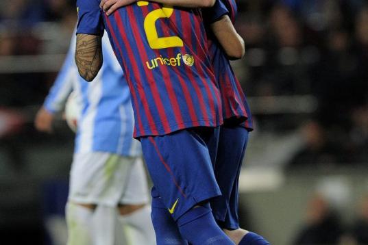 Barcelona's Argentinian forward Lionel Messi (R) is congratuled by his teammate Barcelona's Brazilian defender Daniel Alves (L) after scoring during the Spanish League football match Barcelona vs Malaga at the Camp Nou stadium in Barcelona on Ma...