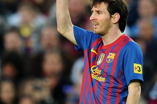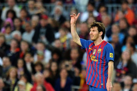 Barcelona's Argentinian forward Lionel Messi gestures during the Spanish league football match FC Barcelona vs Malaga CF on May 2, 2012 at the Camp Nou stadium in Barcelona. AFP PHOTO/LLUIS GENE (Photo credit should read LLUIS GENE/AFP/Ge...