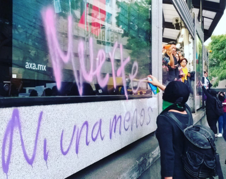 Las brujas, las locas, las histéricas caminaban en las calles, vestidas de negro, con las caras cubiertas con pañuelos verdes y morados; algunas usaban todavía el conocido sombrero puntiagudo. Se veían enojadas. Hacían gritos de guerra, tocaban tambores, se armaron con pintura, con una ‘peligrosa’ diamantina rosa, con carteles atascados de mensajes hirientes: “México feminicida”, decían.