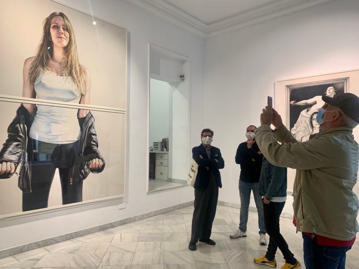 Nada más entrar, un inmenso cuadro, de más de tres metros por dos y pico, te recibía. El retrato de Raquel, una de las mujeres protagonistas de la obra del artista Juan Francisco Casas. Una rubia imponente, colosal, que te miraba sin mascarilla, desafiando al virus y a toda la gente que, desde abajo, la observábamos abrumados, pequeños, vulnerables y temerosos de que el arte, irónicamente y por una vez, fuese contagioso.