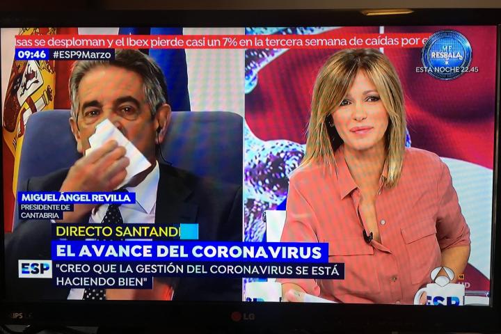 “No es el coronavirus, ¿eh?”, dijo Revilla. “Ya le veo, ya, porque vamos, mucosidad, le veo estornudar... ¿Qué es, un constipado común?”, dejó caer la presentadora, Susanna Griso. “Nada, nada”, quitó hierro el presidente. “Un poco de alergia a la humedad”, terminó reconociendo.
