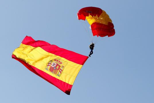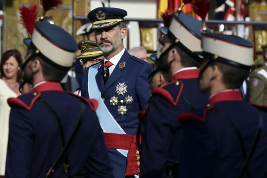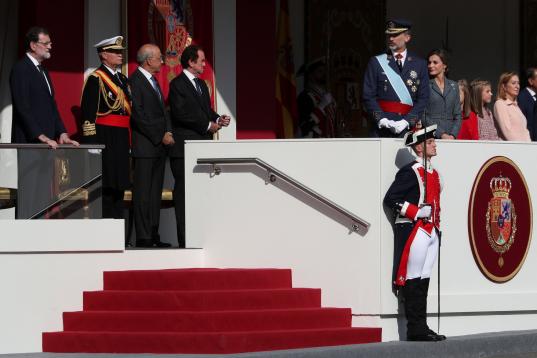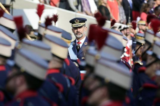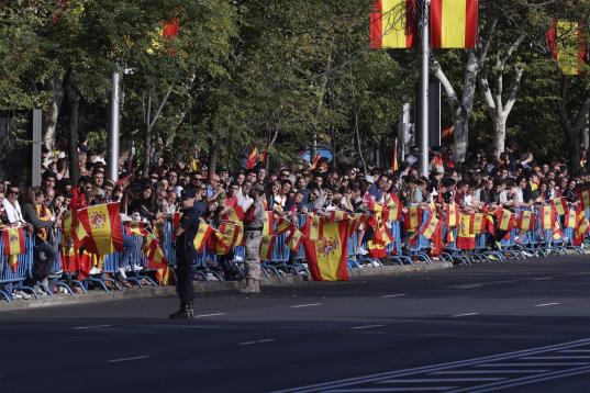 Miles de personas han salido este jueves a la calle para asistir al desfile que se ha celebrado con motivo de la Fiesta del Día Nacional, inundando con la bandera de España el Paseo de la Castellana de Madrid en pleno conflicto por el desafío independentista catalán.