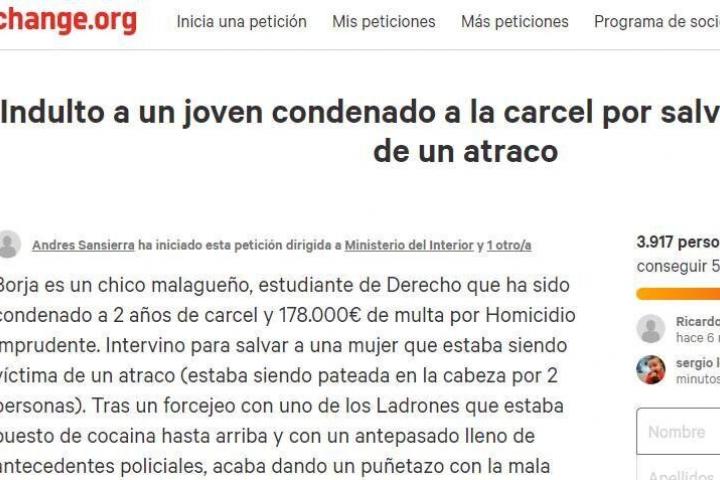 Más de 2.400 personas han firmado una petición en Change.org que reclama el indulto de Borja, un joven malagueño condenado a dos años de prisión y 178.000 euros de multa por “salvar” a una mujer de un atraco con violencia en plena calle, en 2015.