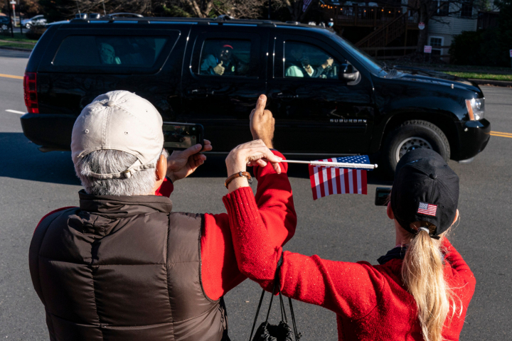 Y el presidente saliente los jalea desde su coche de camino a jugar al golf.