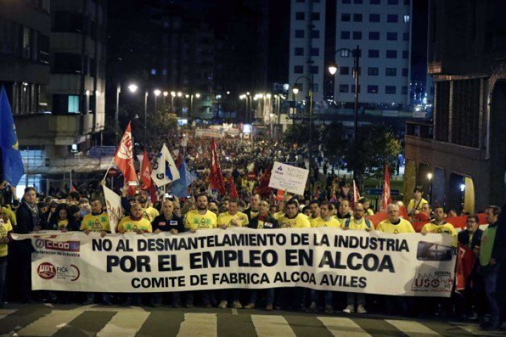 Miles de personas han salido hoy a la calle para "parar los pies a Alcoa" y exigir que se retracte de su decisión de cerrar las fábricas de Avilés y La Coruña y de aplicar un expediente de regulación de empleo (ERE) que llevaría al paro a los 686 trabajadores que conforman ambas plantillas.