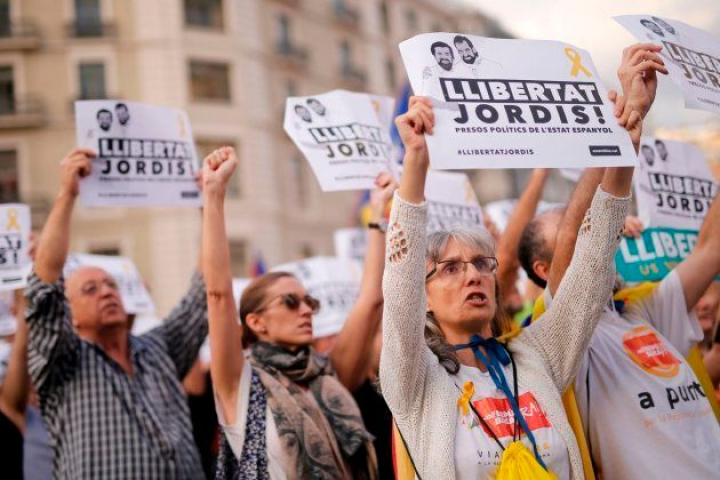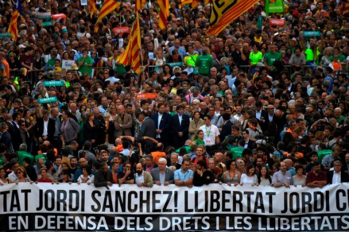 Los presidentes de la ANC y de Òmnium, Jordi Sànchez y Jordi Cuixart, han pedido a los manifestantes que no dejen de apoyar la independencia y el diálogo a la vez.