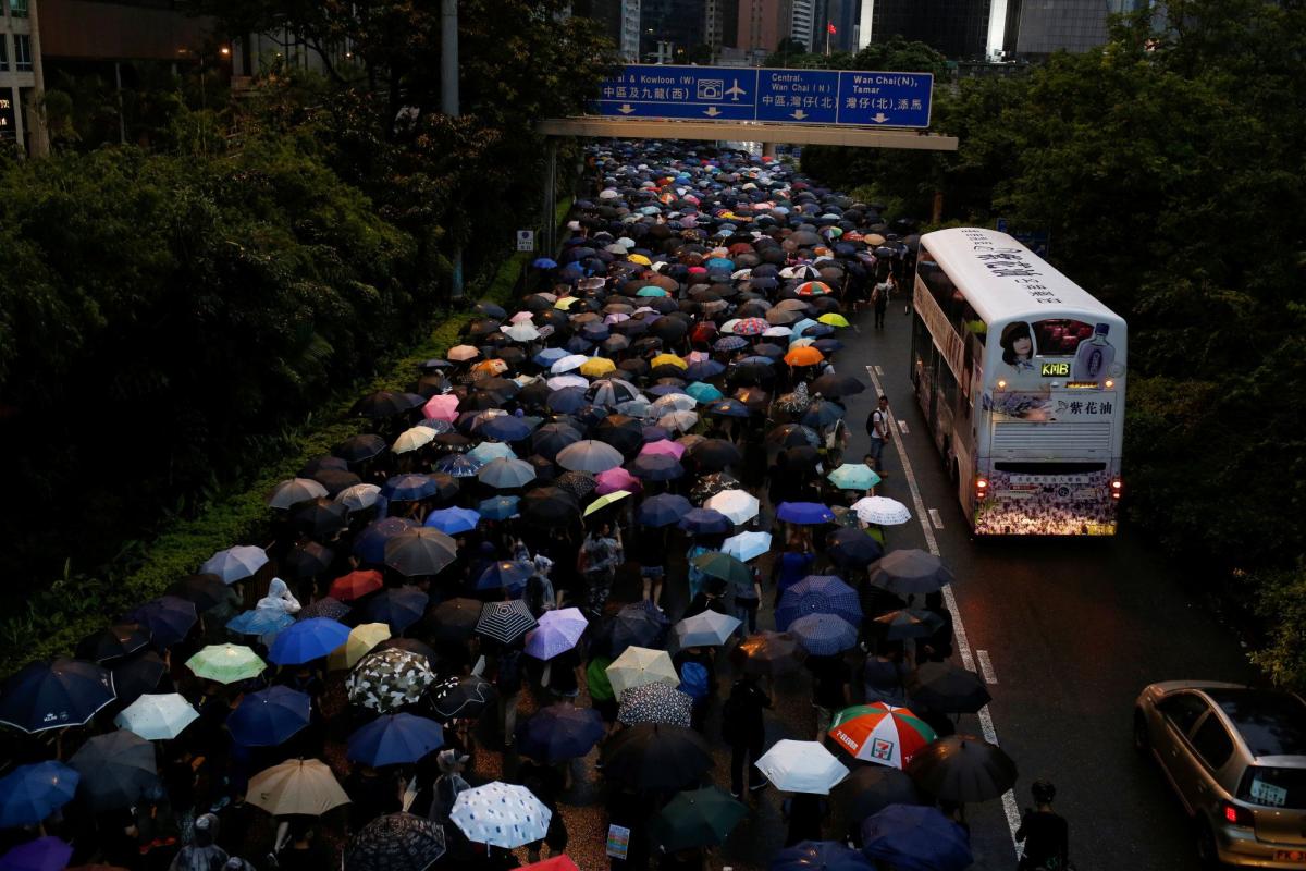 La riada de manifestantes desfiló desde las 14.00 hora local (06.00 GMT) bajo sus paraguas para protegerse de la lluvia en la región administrativa especial e inundaron avenidas y calles adyacentes, sin un destino claro.