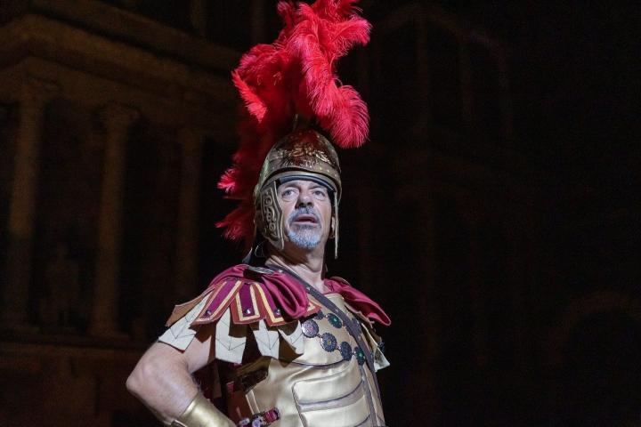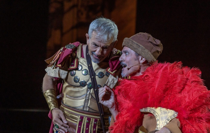 Una naturalidad que arrastra al público. Unos espectadores que se le entregan desde el minuto uno con ese intento de entrada triunfal con el que comienza la obra. Bajando desde la summa cavea (el paraíso de los teatros romanos) hasta la orchestra (el espacio delante del escenario) como si fuera una vedette de revista. A lo que contribuye el inmenso penacho de plumas rojas con el que le han coronado el casco.