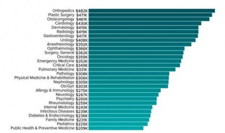 En cambio, las menos lucrativas son Medicina Preventiva y Salud General, Pediatría, Medicina Familiar, Endocrinología y Enfermedades Infecciosas, todas ellas por debajo de los 250.00 dólares al año (alrededor de 220.000 euros).