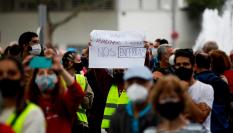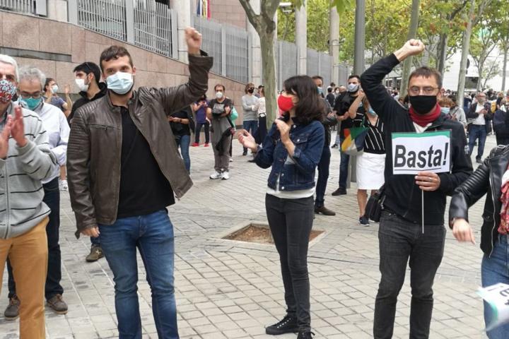 El cofundador de Podemos acude a la manifestación de Vallecas y reclama más maestros y rastreadores a la presidenta de la Comunidad