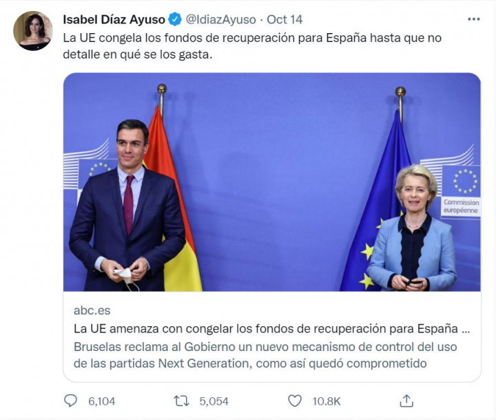 Se trata de un tuit en el que Ayuso se hizo eco de una noticia con el siguiente titular: La UE amenaza con congelar los fondos de recuperación para España hasta que no detalle en qué se los gasta. Una publicación que ella acompañó de este texto: “La UE congela los fondos de recuperación para España hasta que no detalle en qué se los gasta”.