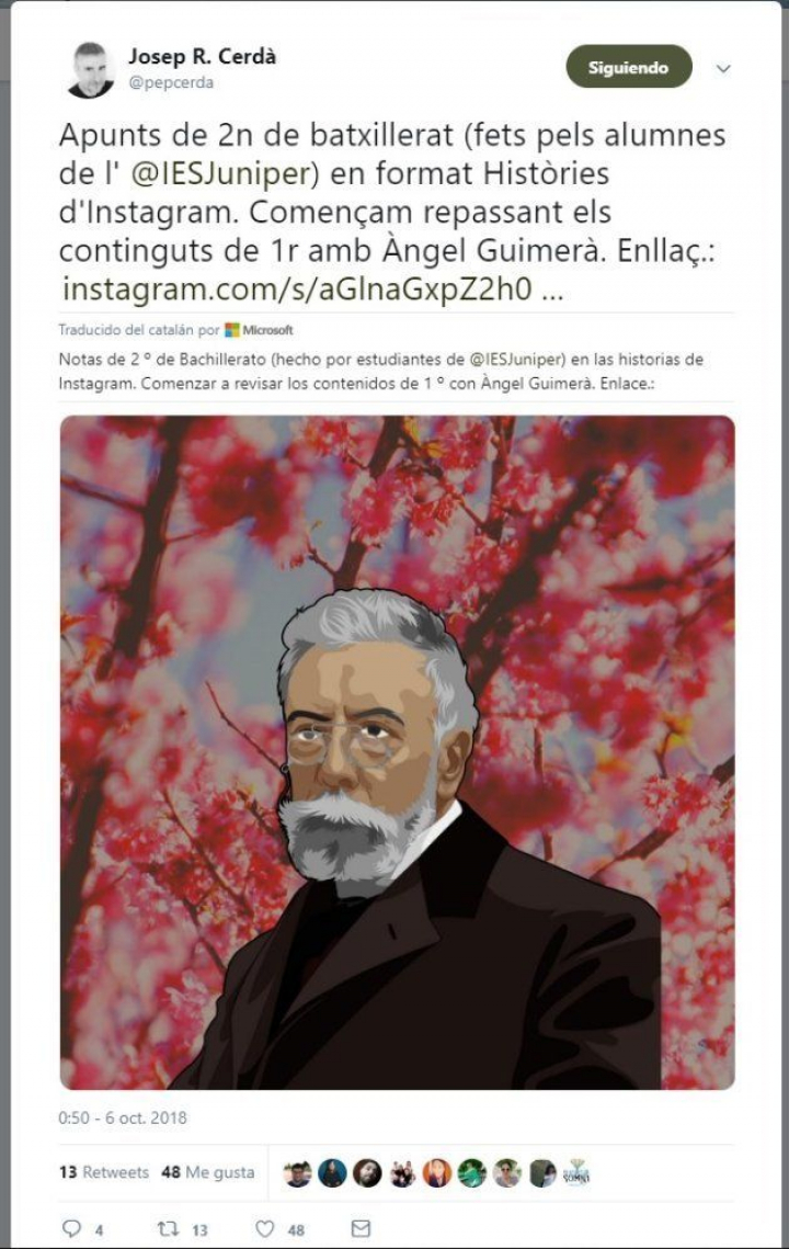 Josep R Cerda (@pepcerda), profesor del IES Juniper, de Palma, usa diferentes apps para motivar a sus alumnos. Por ejemplo, el curso pasado recurrió a plataformas como Canva, Padlet o Generatestatus (para reescribir argumentos de novelas como si fueran diálogos de Whatsapp o de otras redes sociales como Instagram o Facebook). También flippeó algunas clases ayudado de Edpuzzle para que sus alumnos llegaran a clase con el temario aprendido y pudieran así trabajar los comentarios de forma colaborativa. Y más. Hacen gifts de escritoras contemporáneas o preparan fichas con Quizzlet para repasar los contenidos jugando entre equipos. Este curso ha abierto una cuenta en Instagram para ir subiendo información de los autores que tienen que ver en la asignatura. Los resultados le acompañan. Ha mejorado las notas en la temida prueba de la selectividad.