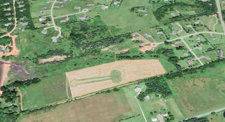El último ejemplo es obra de un usuario de Reddit, que ‘sobrevolando’ la Isla del Príncipe Eduardo, en Canadá, a través de Google Earth se dio cuenta de un curioso dibujo que alguien había hecho en el campo en grandes dimensiones.