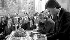 Felipe González y Fernando Morán, firmando la entrada de España en la CEE, en el Palacio Real de Madrid, 1985.AFP via Getty ImagesEl Gobierno de González, con Fernando Morán, al frente, posando en La Moncloa tras lograr la adhesión española a la actual UE. Rafa Samano via Getty Images