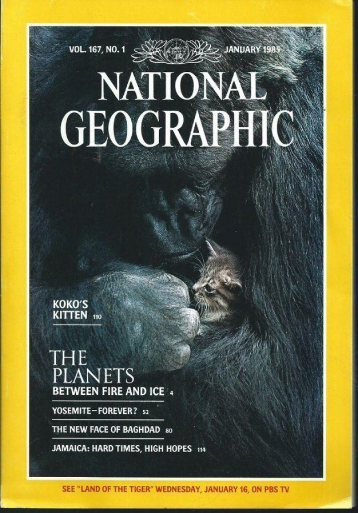 El más notorio, un reportaje de National Geographic que se publicó en octubre de 1978 y en el que la mostraban tomándose un selfie en un espejo: fue la foto de tapa. Koko se hizo famosa posteriormente por su afección por un gatito al que ella misma bautizó como All Ball (Todo pelota). Así llegó su segunda portada para National Geographic, en 1983, con la gorila de 136kg abrazando al diminuto gatito entre sus enormes y peludos brazos.