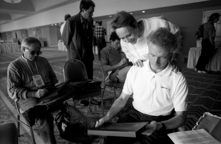 Esther Dyson, de EDventure Holdings, mira sobre el hombro de Larry Tesler, de Apple Computer, mientras él usa una tablet casi prehistórica, en Tucson, en un evento de 1992. Ann E. Yow-Dyson via Getty Images