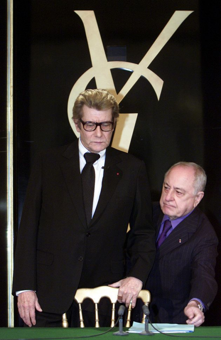 Yves Saint Laurent en una conferencia de prensa en París el 7 de enero de 2002 en la que anunciaba su retirada tras 40 años dedicado a la moda. Junto a él, a la derecha, Pierre Bergé.Reuters Photographer / Reuters
