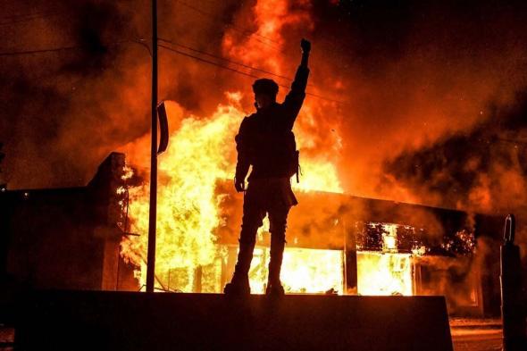Un grupo de manifestantes participa en la quema de una comisaría en Minneapolis.