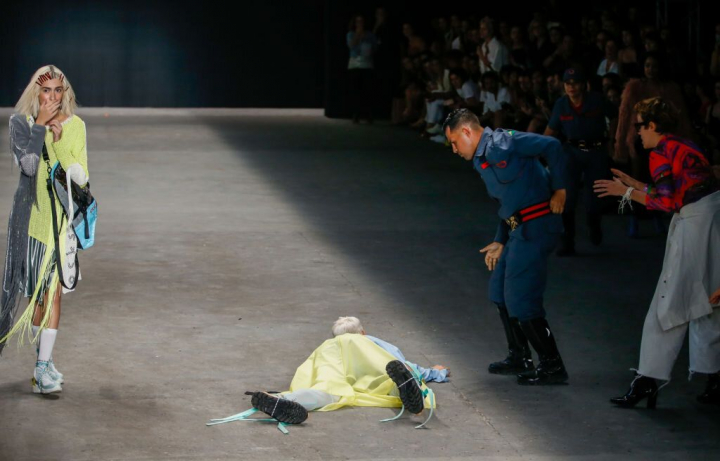“No deberías estar aquí, no deberíamos estar aquí”, gritó señalando a todo el público, y añadió “acaba de morir una persona y estáis aquí como si la vida no valiese nada”, para segundos después abandonar la pasarela, a diferencia del resto de artistas, que permanecieron sentados en un sofá allí instalado mientras transcurría el desfile.