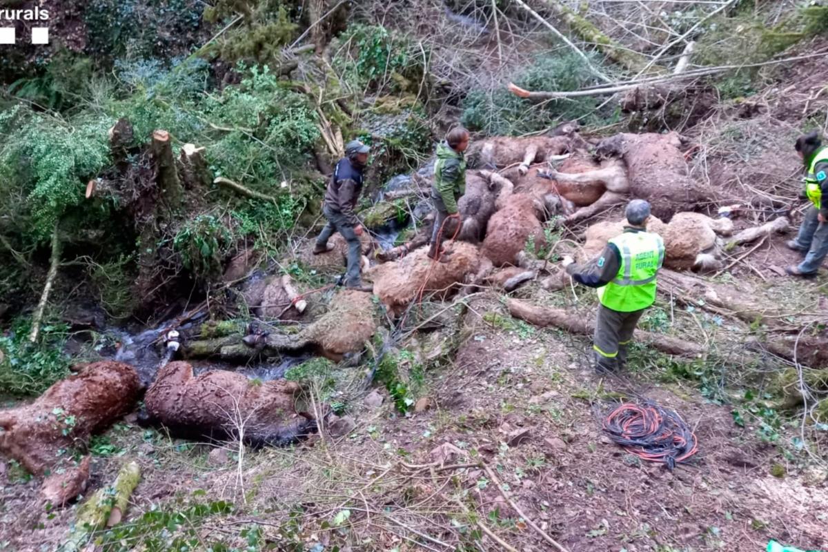 Los Agentes Rurales han recogido esta mañana los cadáveres de quince caballos que el martes cayeron por un barranco de la comarca del Pallars Sobirà (Lleida), después de que les persiguiera un grupo de perros.