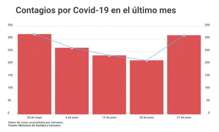 Porque este sábado se registran 315 contagios en la última semana y este es el peor dato del último mes. Desde el 30 de mayo, cuando se acumularon 320 infectados, no se alcanzaban tantos contagios.